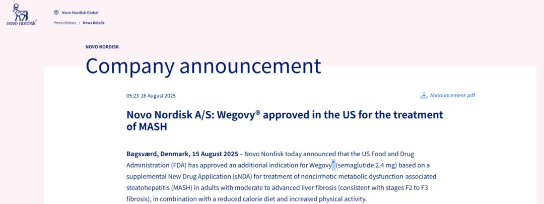 2025年8月15日,美國(guó)食品藥品監(jiān)督管理局(FDA)已批準(zhǔn)司美格魯肽Wegovy?(Semaglutide 2.4 mg)的補(bǔ)充新藥申請(qǐng)(sNDA),用于治療伴有中度至進(jìn)展期纖維化(F2至F3期)的非肝硬化代謝相關(guān)脂肪性肝炎(MASH)成人患者,用藥時(shí)需聯(lián)合低熱量飲食及增加體力活動(dòng)。