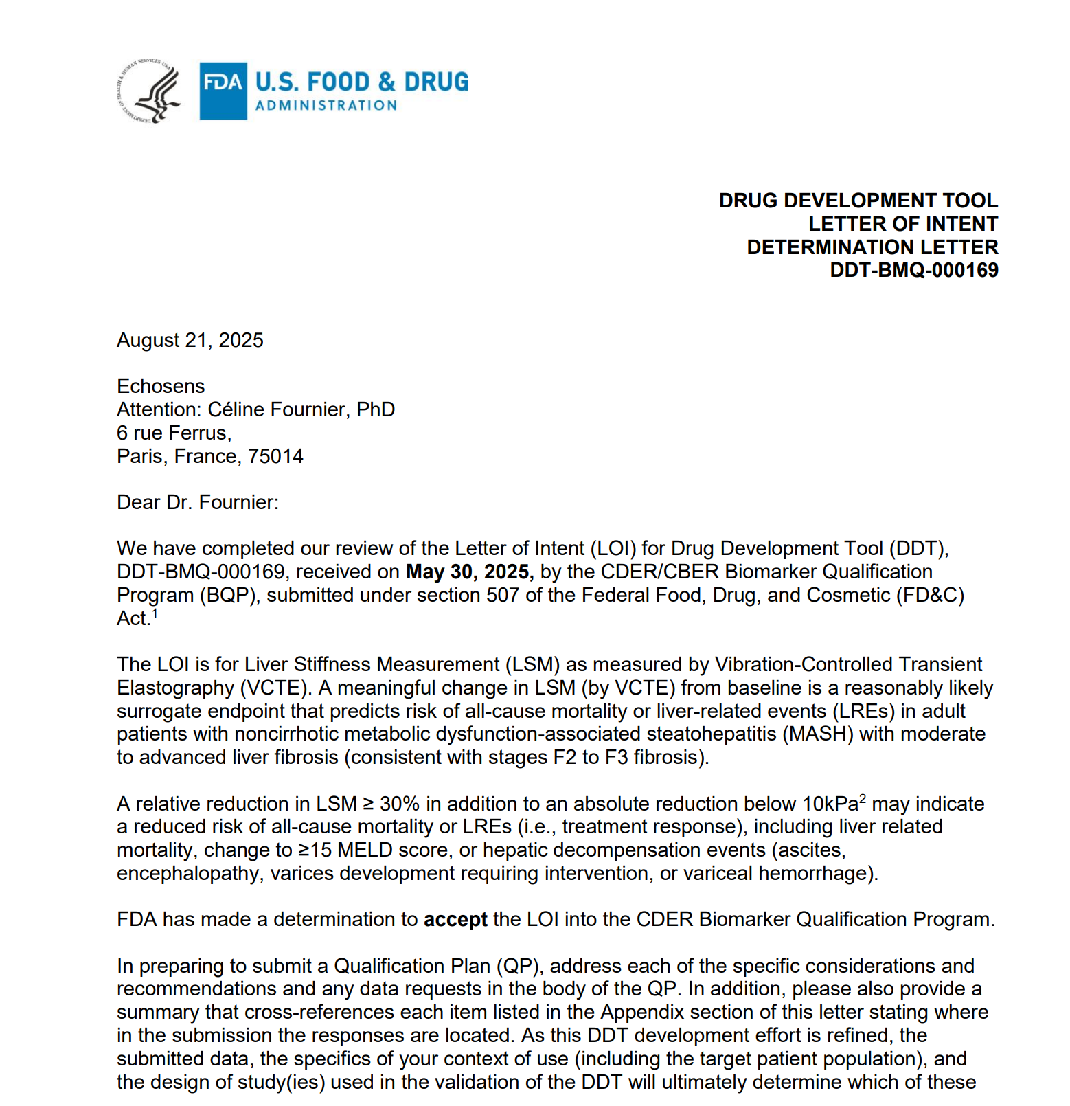 2025年8月,美國食品藥品監(jiān)督管理局(FDA)正式致函福瑞股份子公司Echosens,確認接受其基于振動控制瞬時彈性成像(VCTE)技術(shù)測量的肝臟硬度值(LSM)作為代謝相關(guān)脂肪性肝炎(MASH)臨床試驗替代終點的意向書(LOI)。